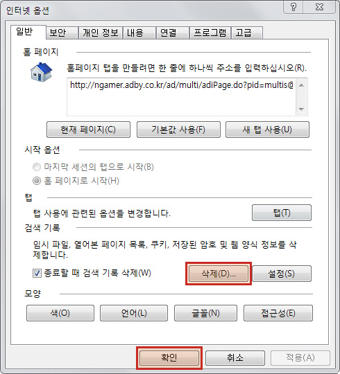1. 인터넷 옵션창 > [일반]탭 > 검색기록 > 삭제를 클릭