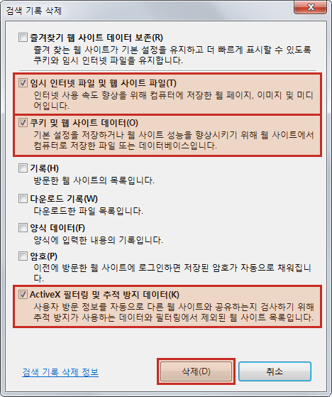 2. 임시인터넷 파일, 쿠키, ActiveX 필터링 및 추적 방지 데이터 3항목만 체크 후 삭제 클릭