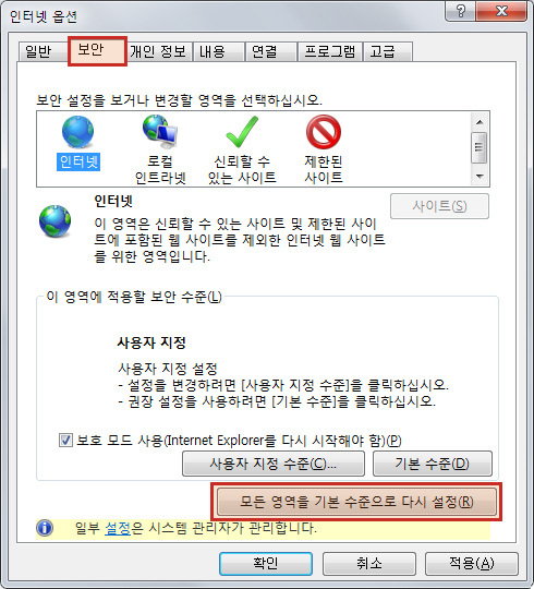 1. 인터넷 옵션 창에서 [보안]탭으로 이동 > 모든 영역을 기본 수준으로 다시 설정을 클릭