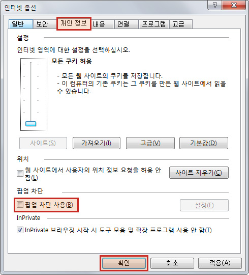 2. [개인 정보]탭으로 이동 > 팝업 차단 사용 체크해제