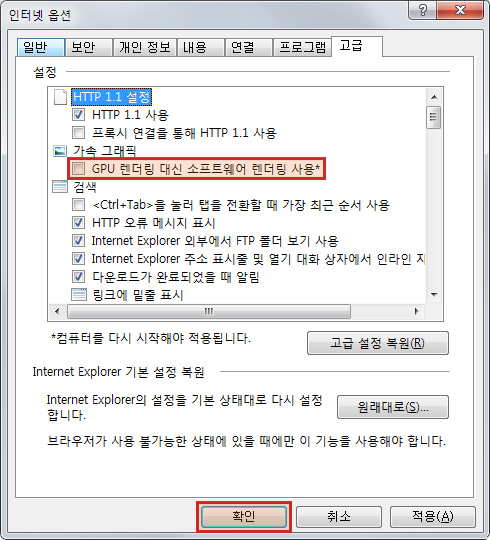 3. [고급]탭으로 이동 > GPU 렌더링 대신소프트웨어 렌더링 사용 체크 (단, Internet Explorer 8 이하 버전에서는 이 항목이 없습니다.)